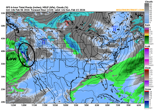 Here we see the forecast graphic showing the precipitation for Sunday morning about 4 AM. Snow and rain have moved into the Sierra and likely spilling over into Valley locations. The parent Low remains off the coast and depending how long it remains in that location will determine total precipitation. The Trough is almost vertical ' this will enhance precipitation making it beyong the Sierra. This is a well positioned Low with Jet stream support and although much can happen in the next 10 days, this looks very promising. FORECAST: Here is what I wrote this morning on our weather site: Friday 2/6/2026 Mostly cloudy and mild with light winds today. Expect Reno to reach 60° and Montreux 57°. Clouds this morning from a weak system to the south may produce some showers mainly in the Sierra and south of Lake Tahoe. We continue with temperatures well above the seasonal average of 50° in Reno. Dry, mild conditions will continue through the weekend with mostly sunny skies. Valley haze caused by an inversion will continue. Finally, a pattern change with some unsettled weather and cooler temperatures beginning Monday. Chances for precipitation are increasing, especially later in the week. The first system may drop a few inches of snow in the Sierra by Tuesday night with Reno likely only seeing a light shower. Periods of clouds and showers mid week, then a better chance for heavier precipitation as we approach the weekend. Temperatures will be below seasonal averages most of the week ahead. The good news is the High Pressure Ridge is breaking down possibly allowing more Winter like weather to impact the area mid to late month.