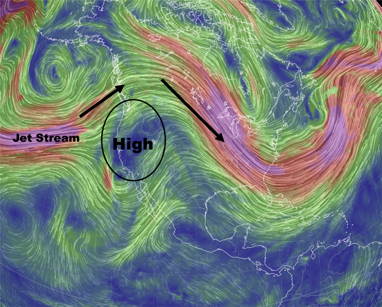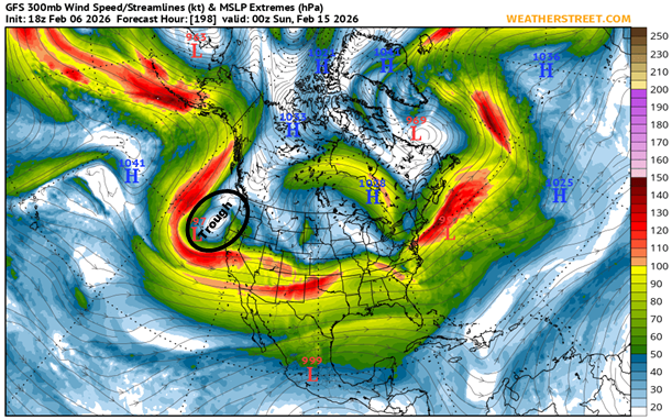 This has been a trend all season, long periods of dry weather and warm temperatures followed by moderate to intense periods of precipitation. We're at the end of the first week of February and as I stated earlier we haven't see any precipitation for almost a month. The culprit in all of this has been a persistent area of High Pressure that has dominated the eastern Pacific this winter. Not only has it brought the west dry, mild weather, it has also been responsible for the frigid winter in the Mid-West and East Coast. At times the Jet Stream was so amplified it reached into the Arctic before dropping rapidly into the eastern US. Below is a snapshot of the current position of the High Pressure Ridge and Jet Stream at 500 mb.