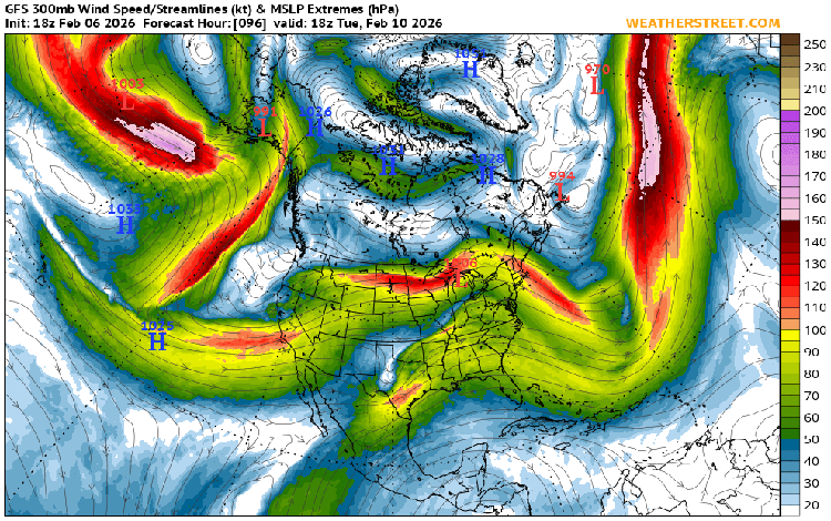 In this forecast graphic we can see the Jet Stream ( Lime Green ) running west to east next Tuesday. The Jet is not very strong, only a small red area, winds at about 30,000 ft of around 110mph. This gives us some indication of intensity of any storms riding in on the Jet Stream. This is likely not going to produce much in the way of storminess, but upstream you can see a stronger section of the Jet which will impact us later in the week.