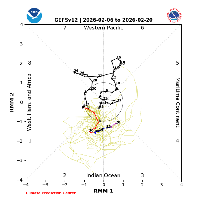 Here we have our friend the Madden Julian Oscillation (MJO) for the same period. The number along the red line starts the forecast from today, the 6th through the 20th. When the MJO is in this space, it is favorable for precipitation on the West Coast. Here you can see the chart that shows the MJO effect. This is a positive signal to reinforce our forecast and beyond. Speaking of beyond, I am encouraged that the Ridge that has been blocking our winter storm system is not going to return anytime soon. Beyond this forecast I see the rest of February with a mix of dry days and unsettled days with more precipitation for our area. I also see a fairly wet March, likely any snow will be fairly high, 6500 ft or above, by there is always that chance we could see some snow in lower elevations. Don't give up on a near normal snowpack either, it can come fast and furiously. That all for now, we will keep looking forward for more signs of powder for our skiing friends. If you want a hard copy of our Winter forecast you can view a .PDF copy HERE. Check our daily report and the National Weather Service for updates. Our daily report on our weather station site, looks 3 to 5 days ahead. Please comment, if you like, on our forecasts, your own observations, or anything else. Our email link is posted below.