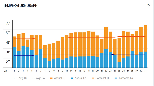 February 6, 2026 It has been another long dry spell in Northern Nevada and the Sierra since early in January. The last time we recorded any precipitation at our weather site was January 8th. Our precipitation total for the month of January was 1.50", well below average. If we look back at the last three months of 2025 we can see a pattern of long dry spells and then intense precipitation. We recorded 1.70" in October, all in the few few days of the month, then nearly a month before the next period of precipitation late in November totalling 2.60". A long dry spell until December 18th when we had heavy precipitation, especially in the Sierra. We recorded 5.56" of precipitation, mostly rain below 6500 ft. in December. Along with the long dry periods we have seen well above average daytime temperatures. Most days have been ten to fifteen degrees above average with strong inversions. Many days we saw temperatures in Montreux exceed the temperature at the Reno airport. Below is a temperature graph for January in Reno, all but 7 days exceeded the average daytime temperature.